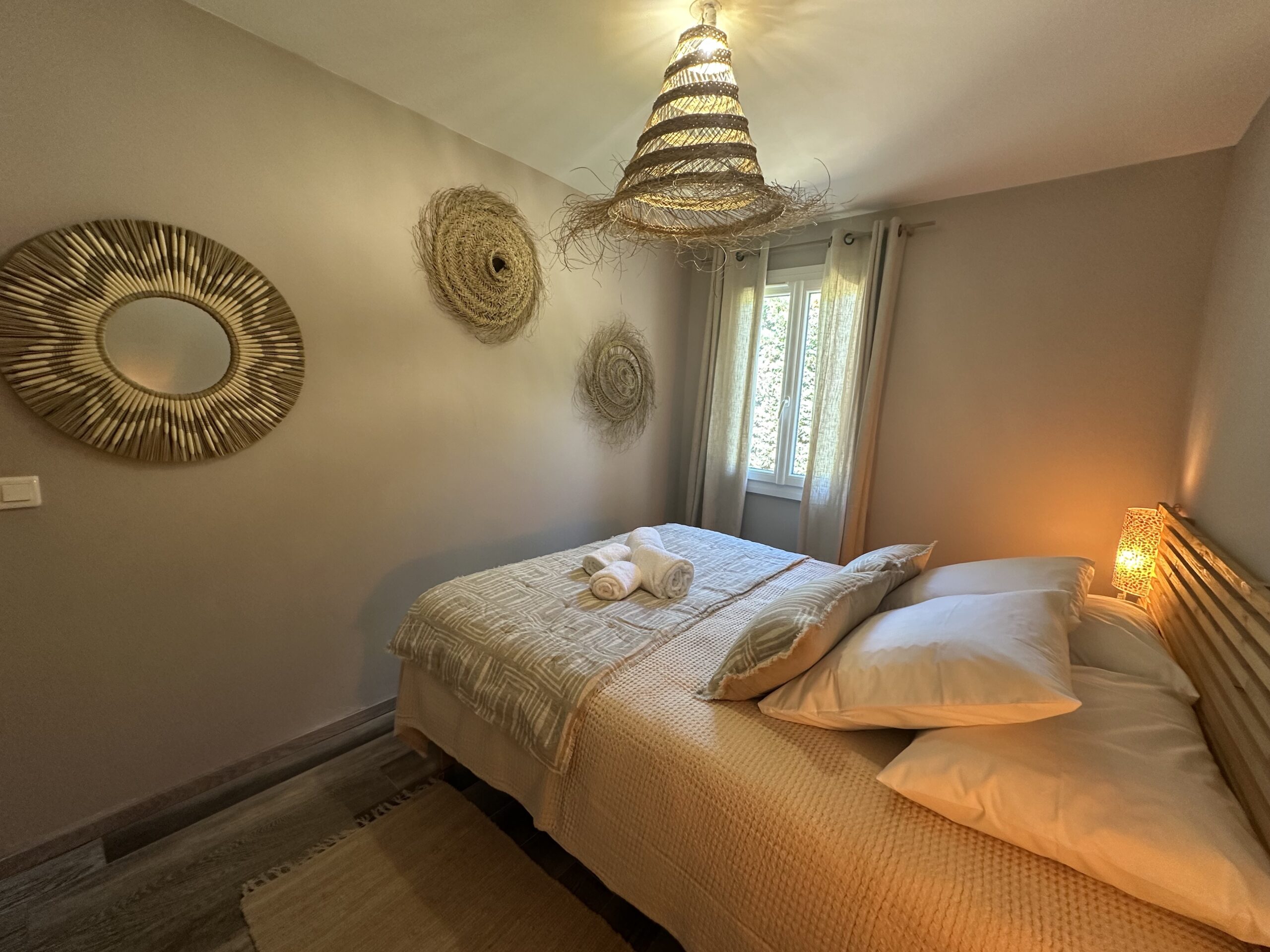 Chambre élégante et apaisante, décorée dans un esprit naturel. Elle dispose d'une literie toute neuve, très confortable, soigneusement préparée pour garantir des nuits reposantes. Les matériaux naturels, les tons doux et la décoration murale créent une atmosphère chaleureuse et relaxante.