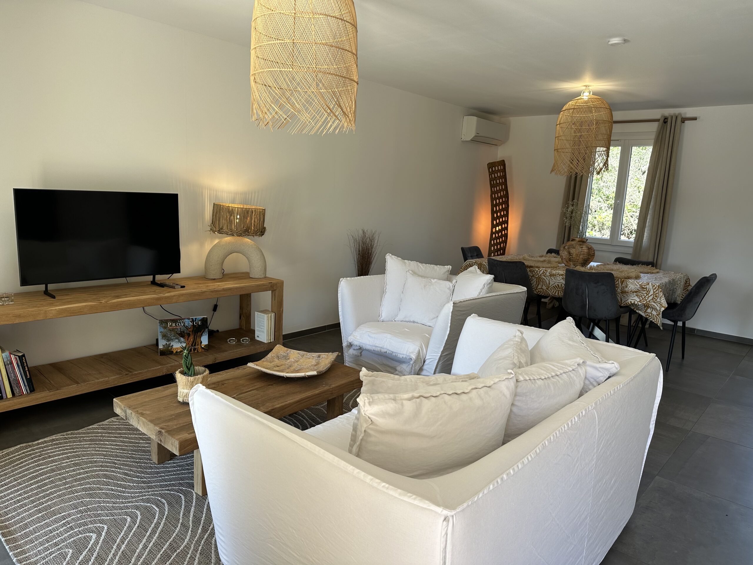 Salon spacieux et lumineux, aménagé dans un élégant esprit naturel. Les canapés confortables aux tons clairs invitent à la détente, tandis que le mobilier en bois massif et les luminaires en fibres naturelles créent une atmosphère chaleureuse et apaisante. Le coin salon dispose d'un espace TV convivial. Ouvert sur la salle à manger et baigné de lumière grâce aux garndes ouvertures, cet espace de vie est parfaitement adapté pour partager des moments agréables en famille ou entre amis.